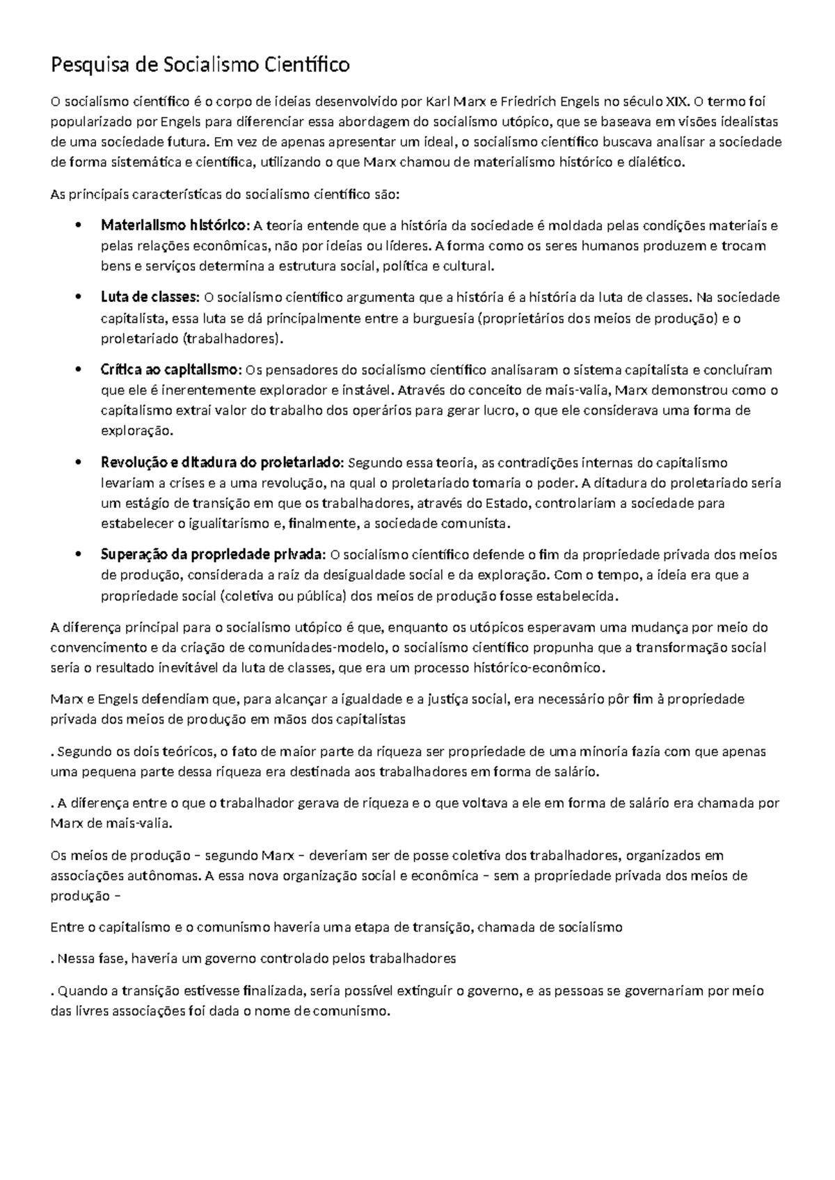 Escreva Um Pequeno Texto Sobre O Socialismo Científico